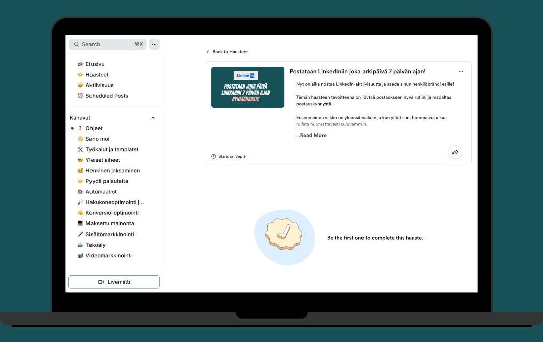 "Postaa LinkedIniin joka arkipäivän viikon ajan"